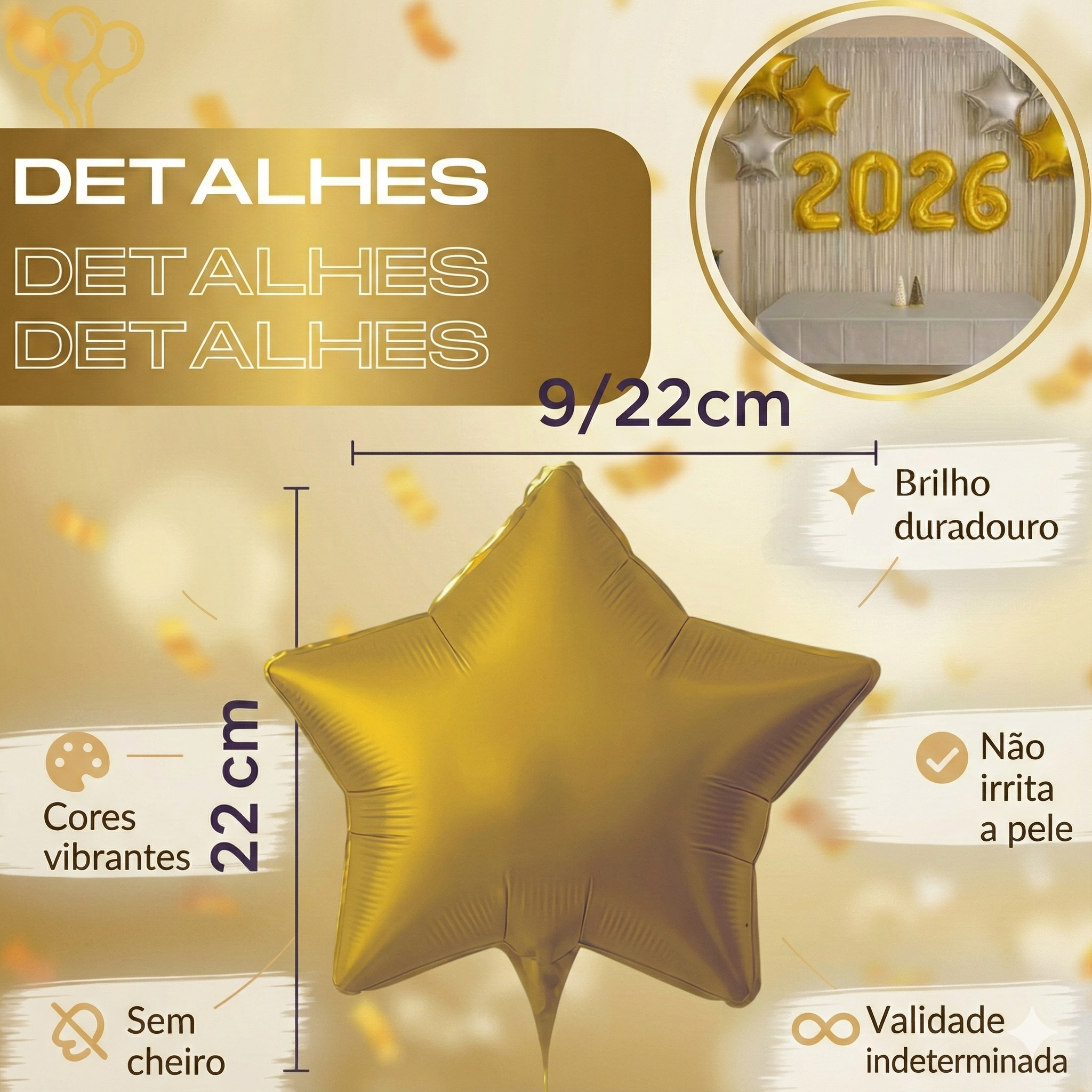 - Memórias Fotogênicas: Crie o fundo perfeito para as fotos da virada. O acabamento metalizado garante o destaque ideal nas imagens.